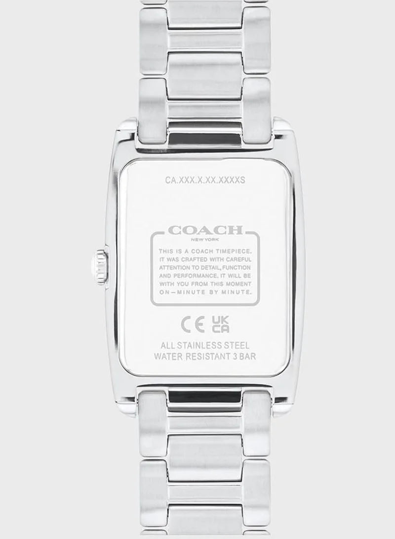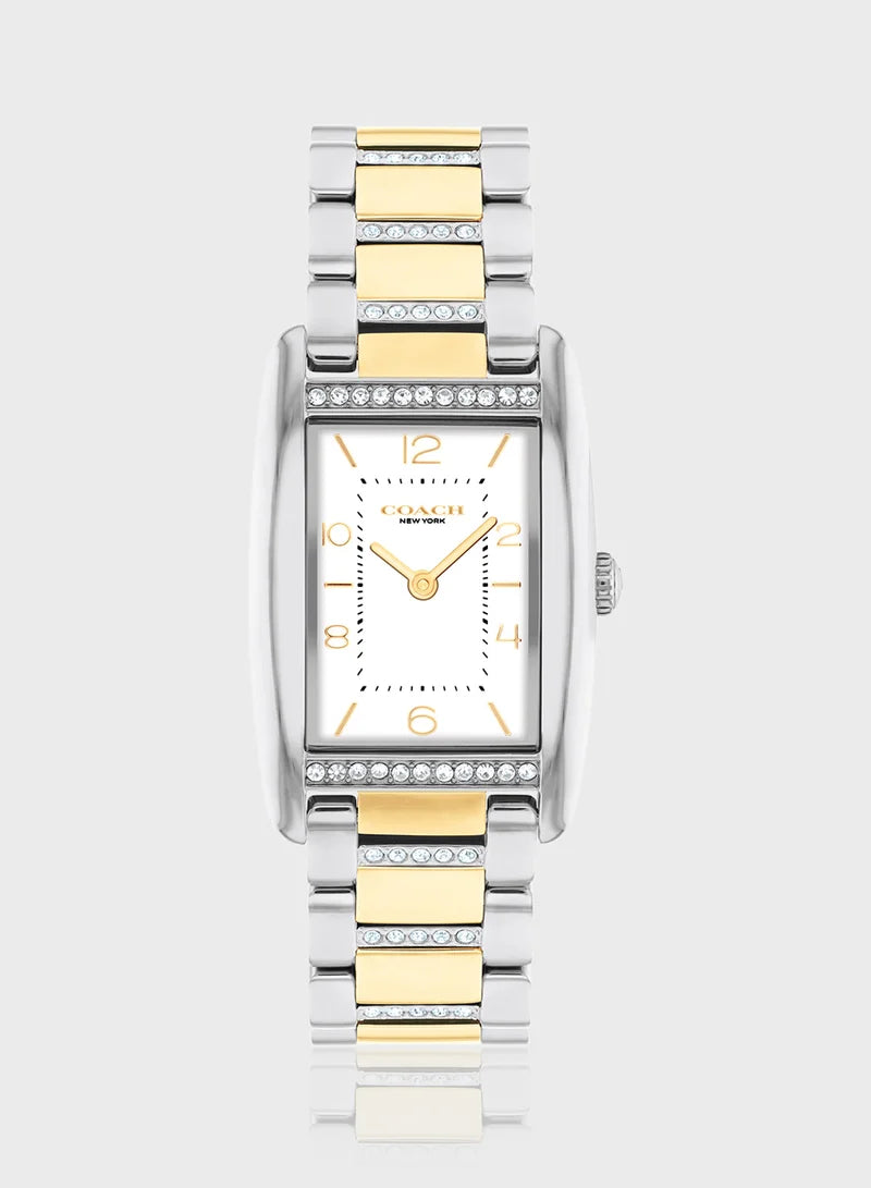 ساعة ريس بتصميمها الفخم والمميز، خيارٌ أنيقٌ لكل يوم. تتميز هذه الساعة بتصميمها ثنائي اللون من الفولاذ المقاوم للصدأ والذهبي، المتلألئ بالكريستال، وبمينا ساتان أبيض مزين بمزيج من المؤشرات الرقمية والعصاية. كما أنها مزينة بشعار كوتش الشهير على المشبك لإضفاء لمسةٍ تراثية. #هيكل وسوار من الفولاذ المقاوم للصدأ والذهبي. القطر التقريبي للهيكل: ٢٤ مم × ٣٥ مم. كريستال معدني. حركة كوارتز. قفل قابل للطي. مقاومة للماء حتى عمق ٣٠ مترًا.