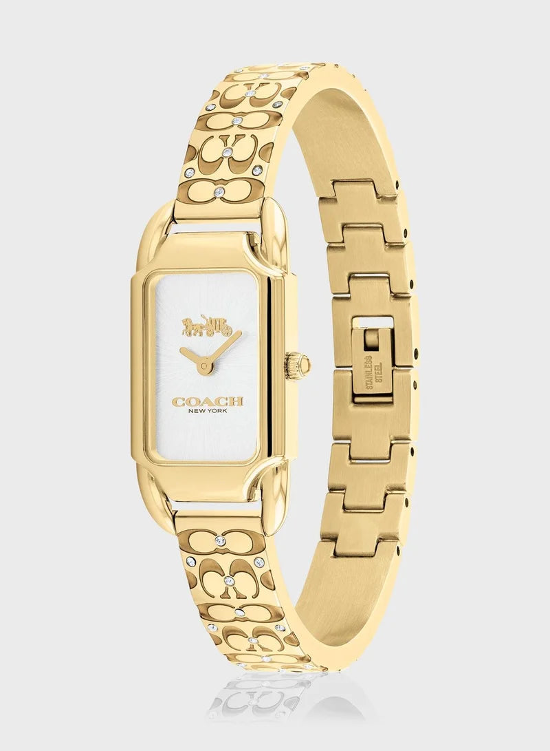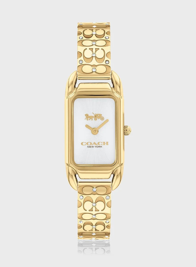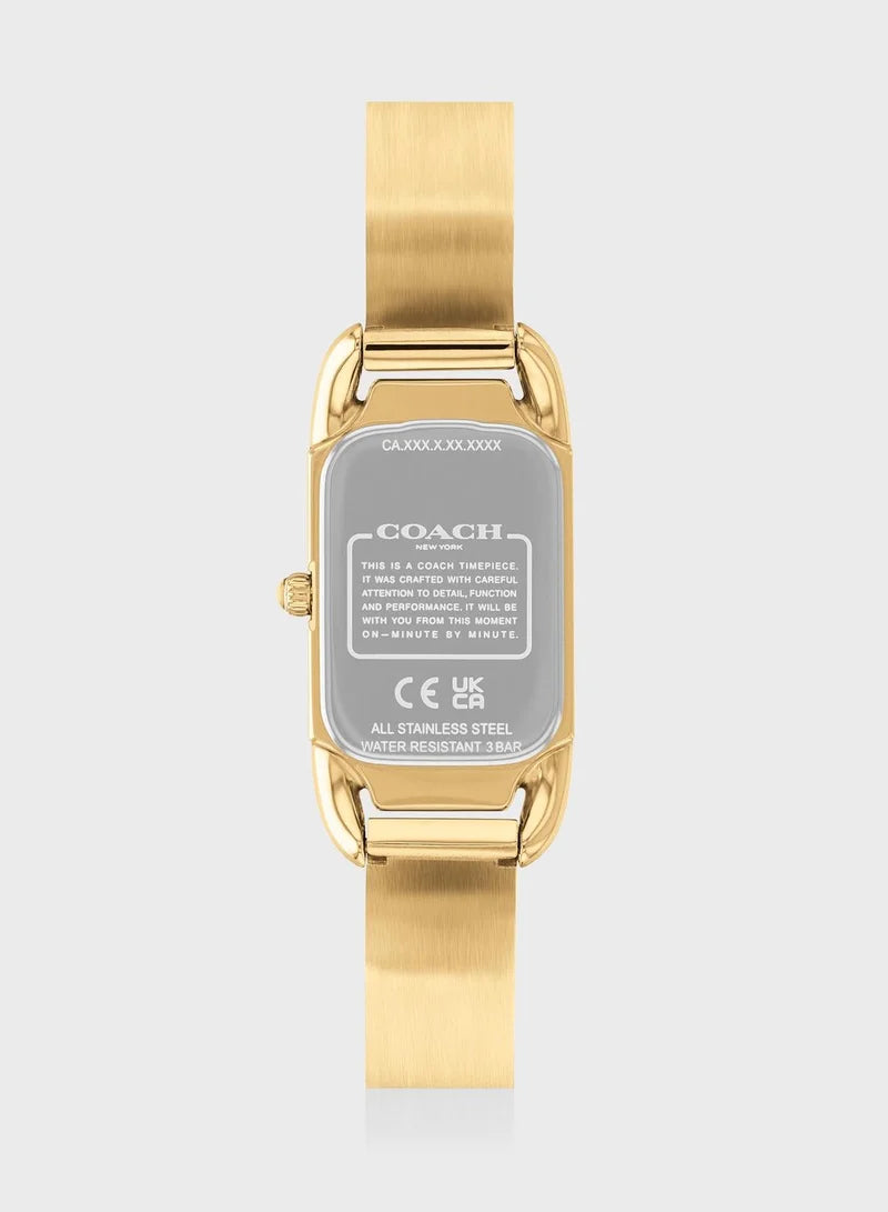 ساعة كادي، مستوحاة من التصاميم الأنيقة لفن الآرت ديكو في عشرينيات القرن الماضي، تتميز بتصميم أنيق وطويل ونحيف. تتميز الساعة الذهبية بسوار شفاف من المينا محفور عليه توقيع كوتش. ميناءها الفضي الأبيض مزين بنقش الحصان والعربة الشهير لكوتش. #علبة ذهبية اللون وسوار من المينا. القطر التقريبي للعلبة: 17.5 مم × 28.5 مم. كريستال معدني. حركة كوارتز. قفل بإبزيم قابل للطي. مقاومة للماء حتى عمق 99 قدمًا.