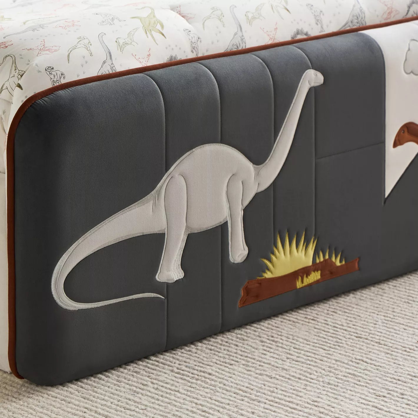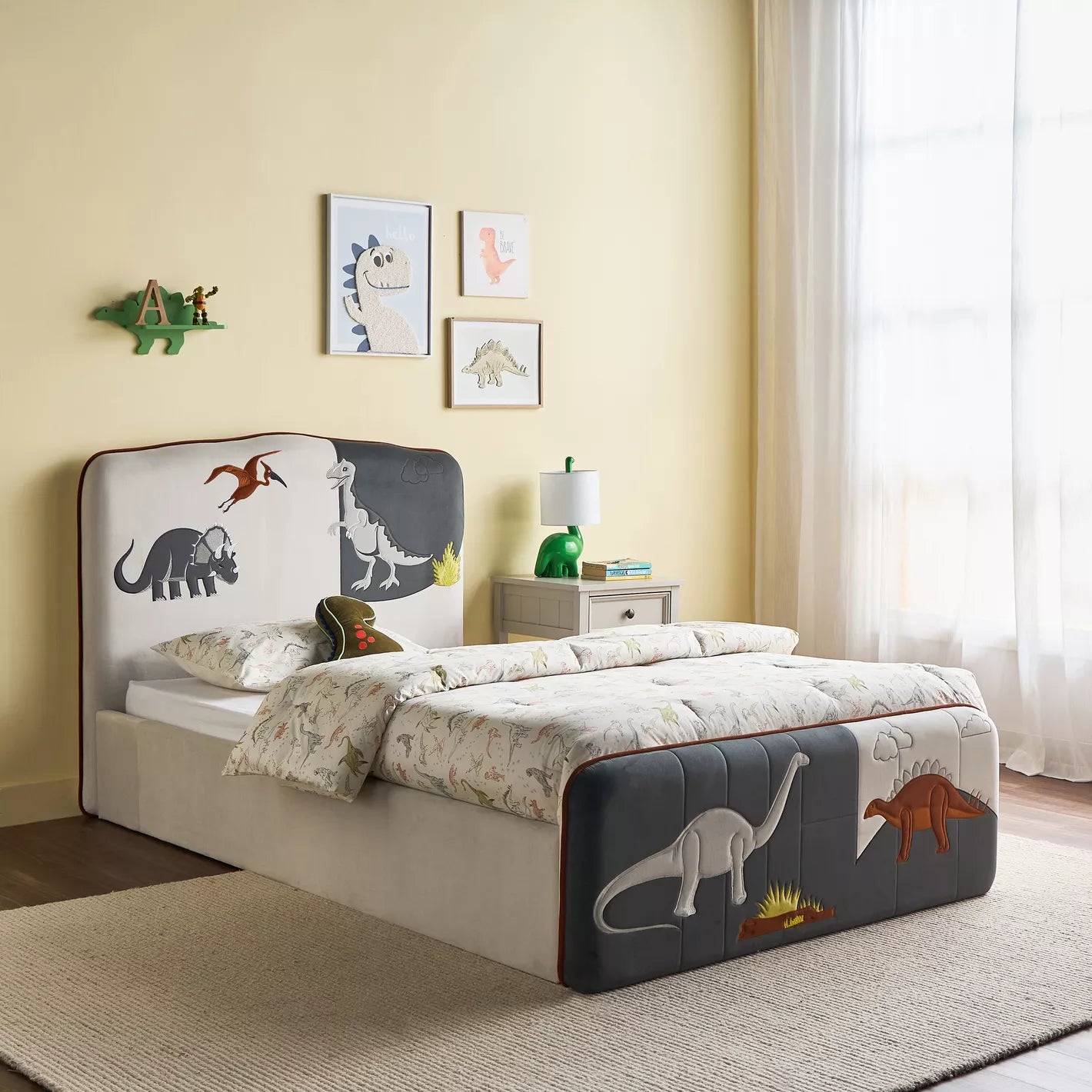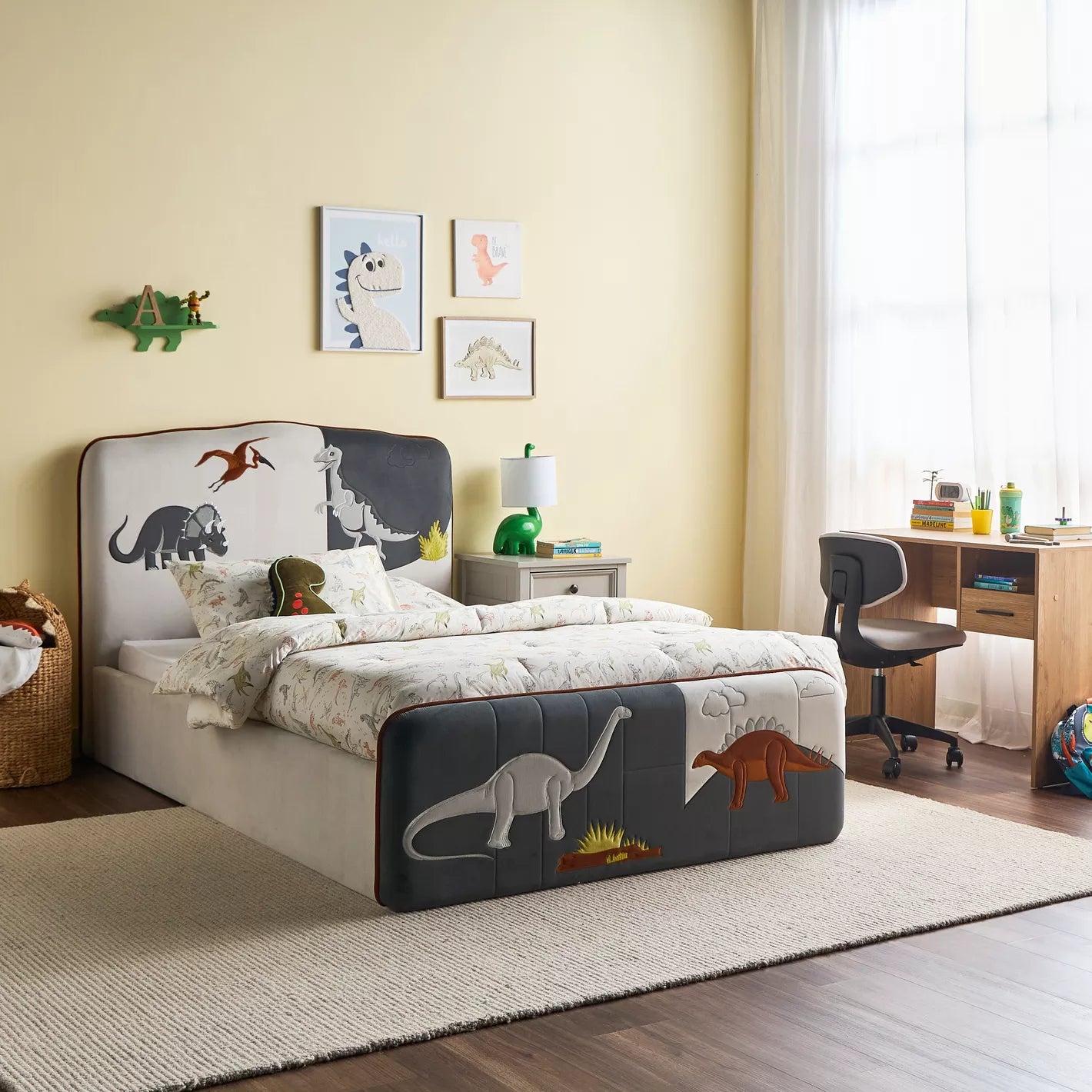 يتميز هذا السرير الساحر بتصميم مرح مستوحى من الديناصورات، مثالي لغرف نوم أي طفل. تُصوّر الرقع المطرزة ديناصورات ملونة متنوعة، مما يخلق نقطة محورية ممتعة وجذابة. مصنوع من قماش عالي الأداء، هذا السرير المنجد سهل التنظيف والصيانة، بينما يضمن إطاره الخشبي المتين الثبات والمتانة. سيحوّل هذا السرير المريح والآمن أي غرفة نوم إلى جنة من عصور ما قبل التاريخ.