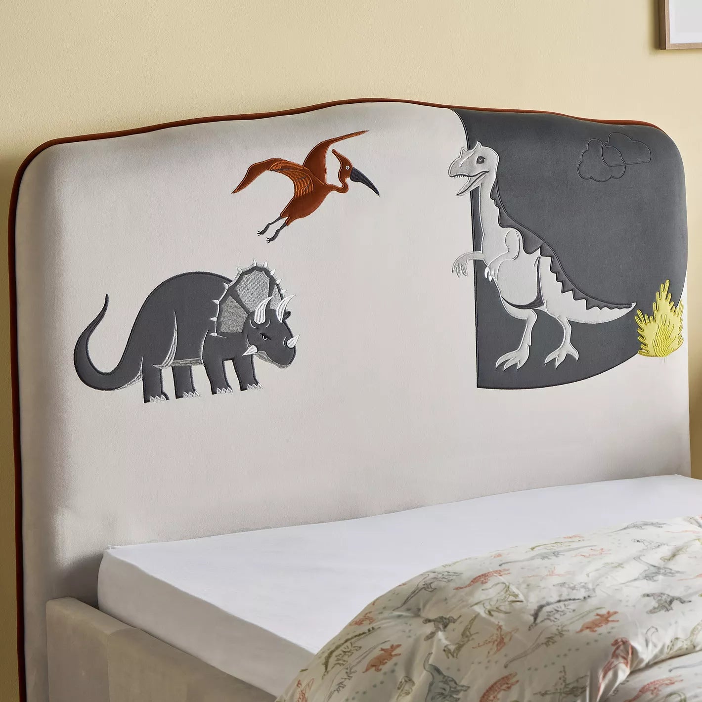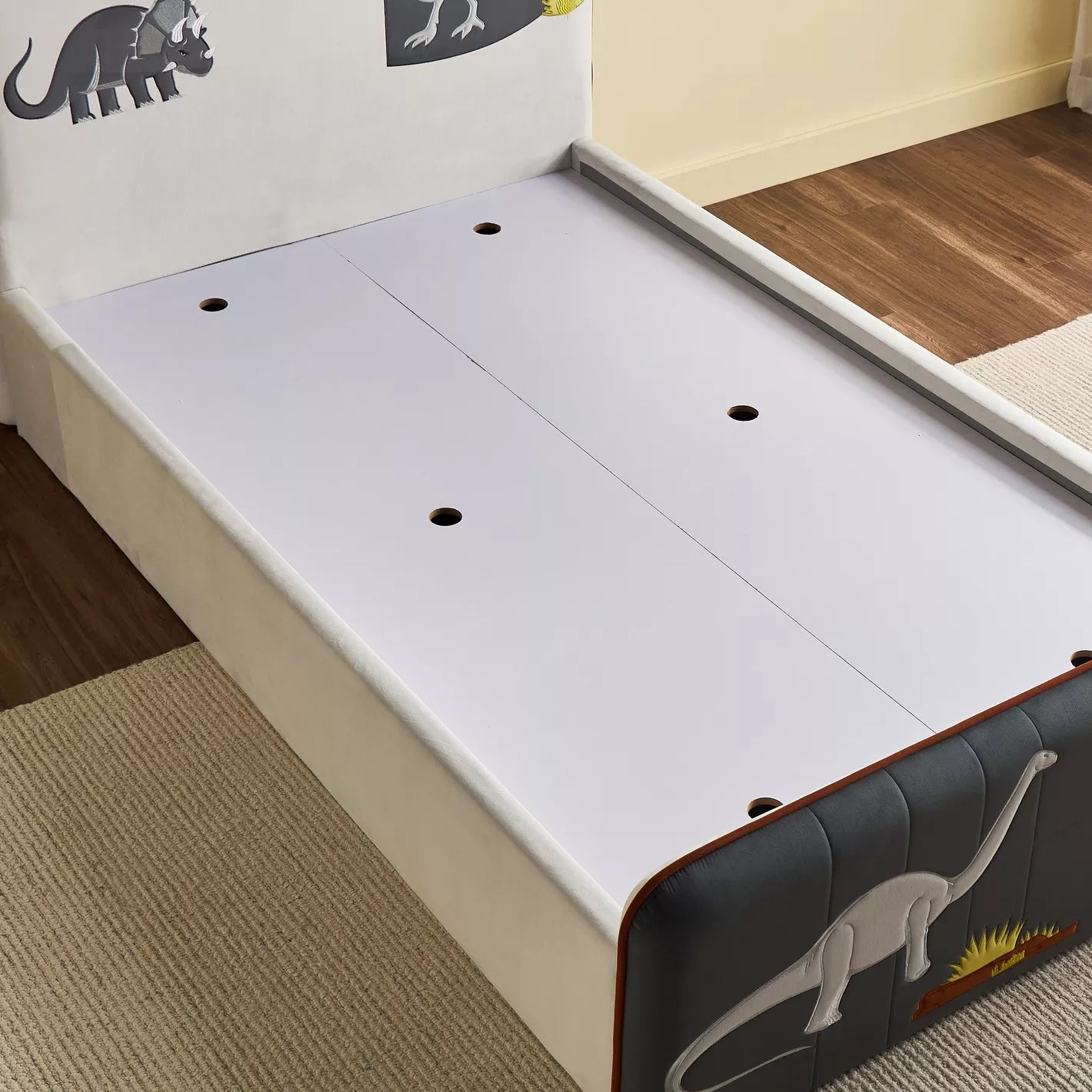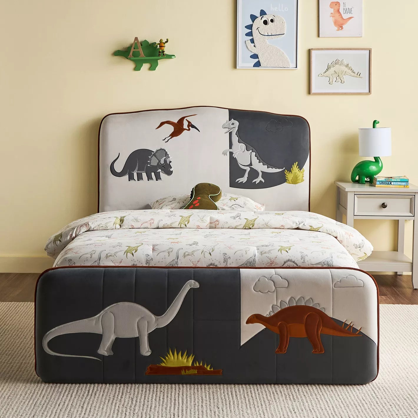 يتميز هذا السرير الساحر بتصميم مرح مستوحى من الديناصورات، مثالي لغرف نوم أي طفل. تُصوّر الرقع المطرزة ديناصورات ملونة متنوعة، مما يخلق نقطة محورية ممتعة وجذابة. مصنوع من قماش عالي الأداء، هذا السرير المنجد سهل التنظيف والصيانة، بينما يضمن إطاره الخشبي المتين الثبات والمتانة. سيحوّل هذا السرير المريح والآمن أي غرفة نوم إلى جنة من عصور ما قبل التاريخ.