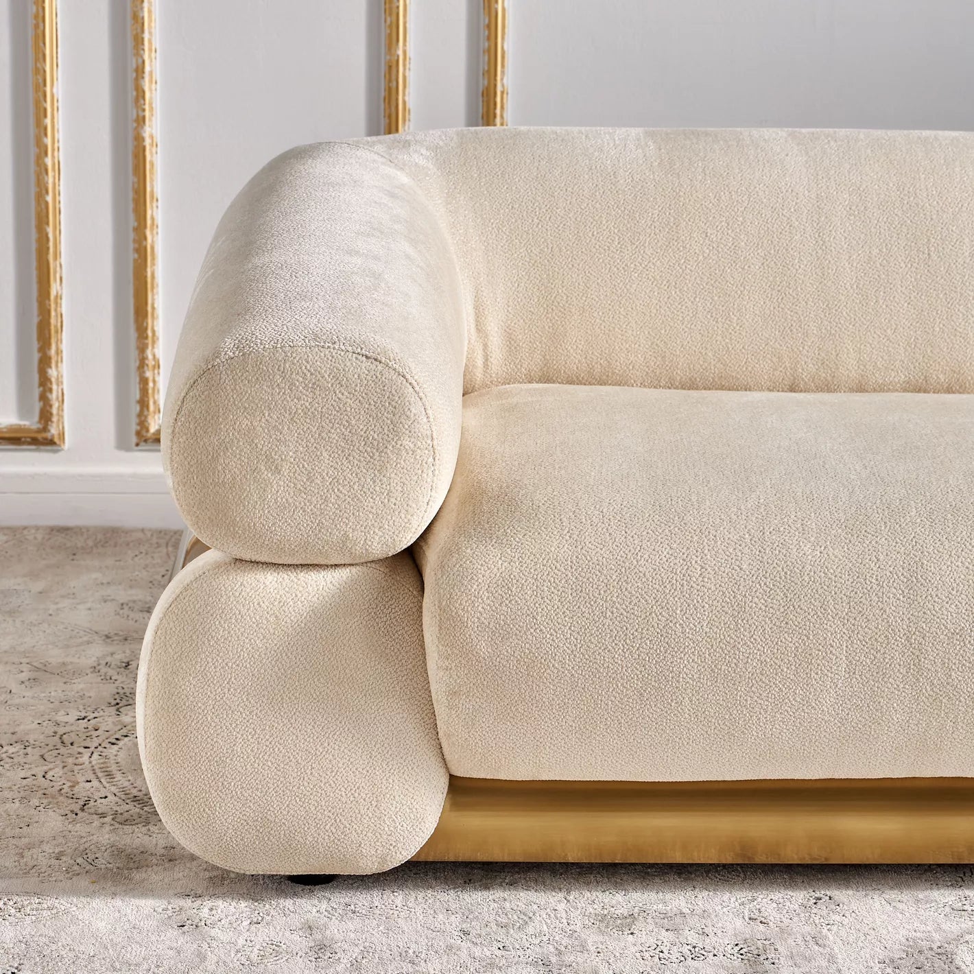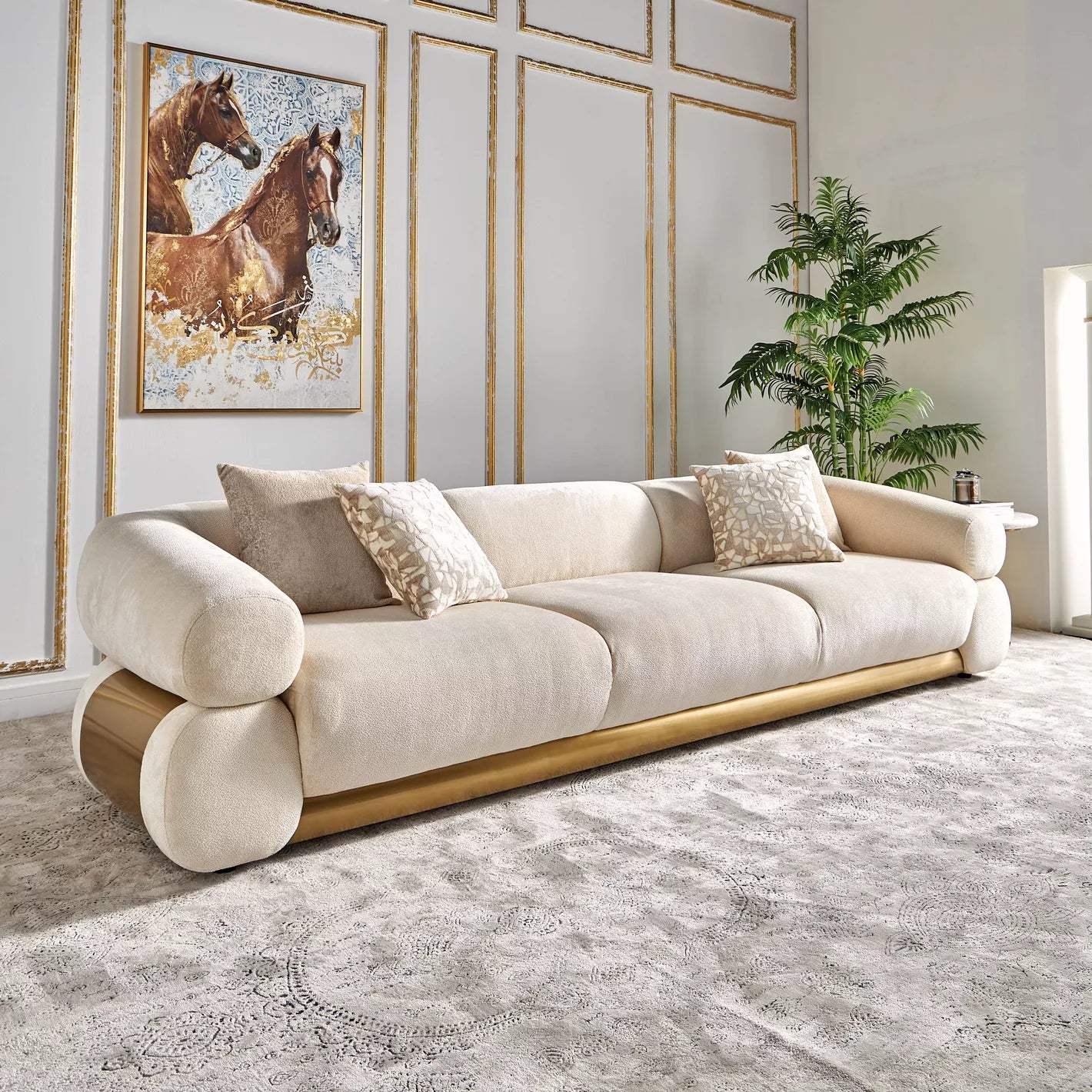 هذه الأريكة ذات الأربعة مقاعد مزينة بقاعدة رائعة تُضفي لمسة من الأناقة وتُحسّن مظهرها العام. قماش المخمل المُستخدم في التنجيد يمنحها ملمسًا ناعمًا وفاخرًا يُعزز مظهرها وملمسها. مع مقاعدها الواسعة والعميقة، يُمكنك الاسترخاء براحة تامة. لا تُضفي الأذرع المستديرة لمسة أنيقة فحسب، بل تُوفر أيضًا مكانًا مريحًا لذراعيك. يُعدّ الغلاف المعدني المصقول على الذراع الجانبي عنصرًا تصميميًا رائعًا يُعزز المظهر العام للأريكة.
