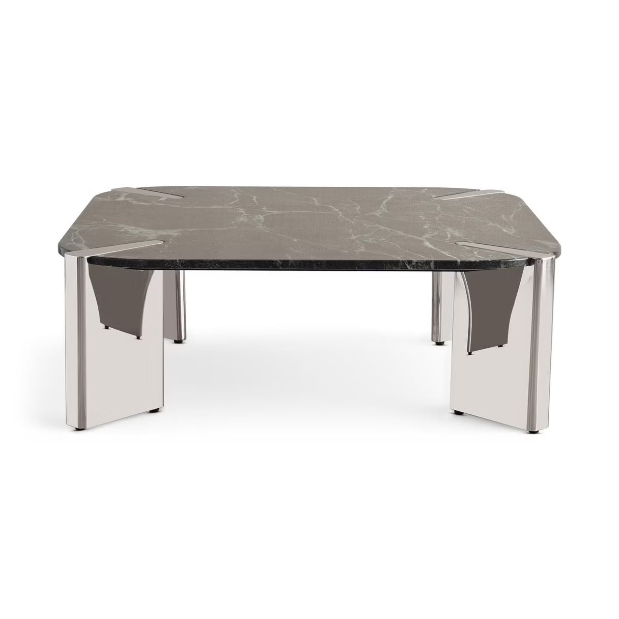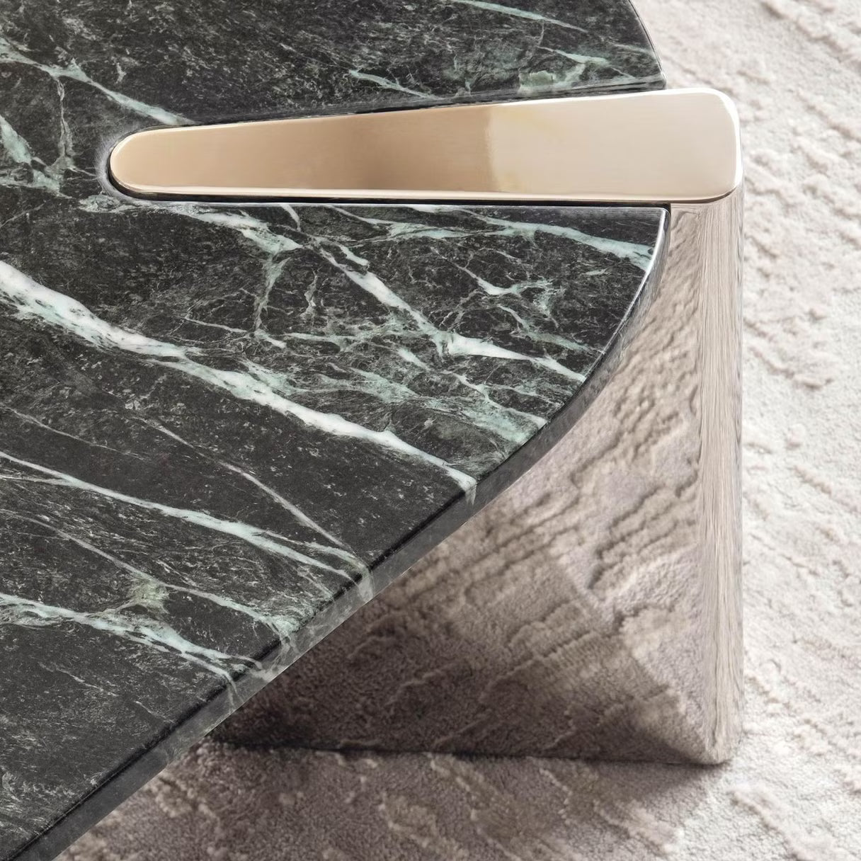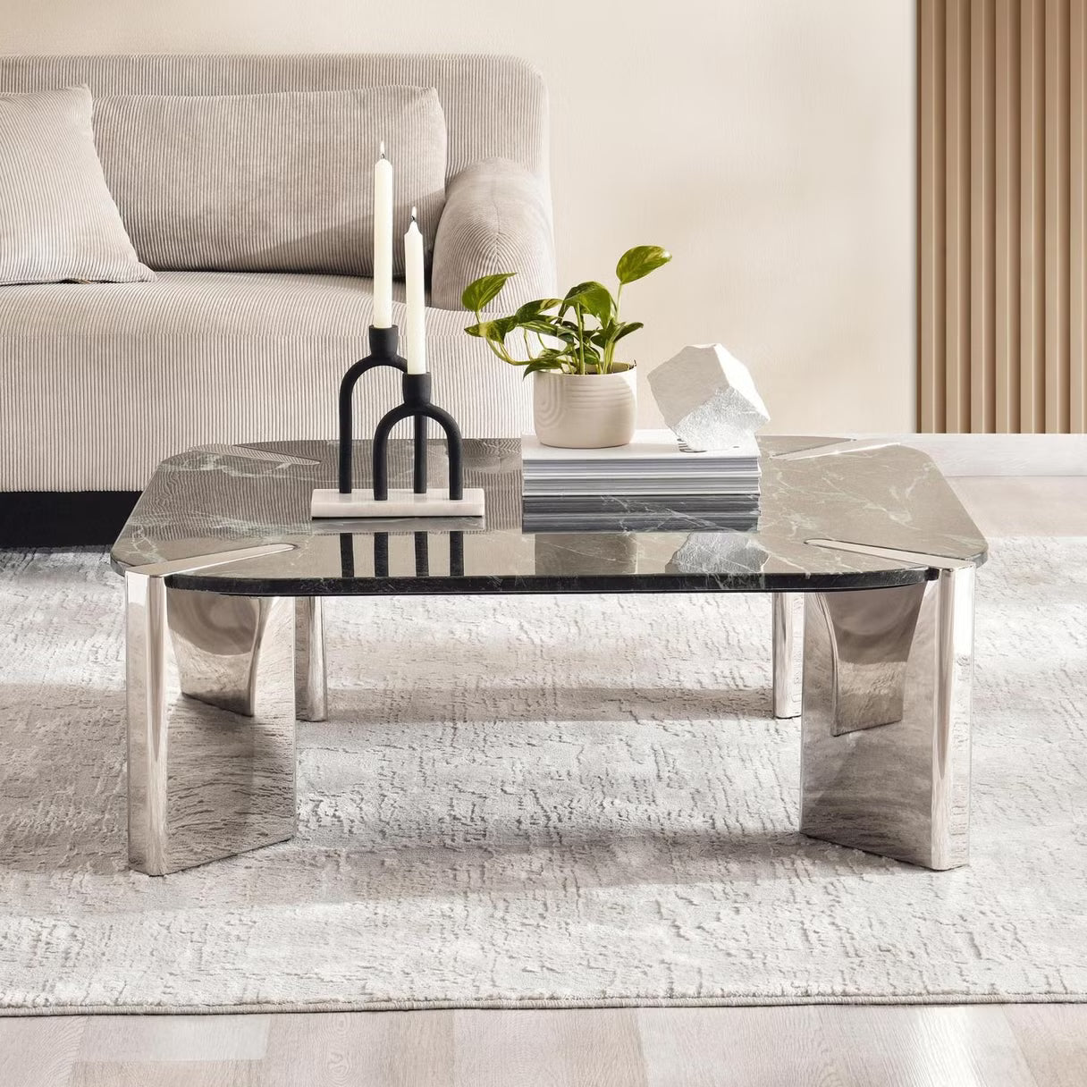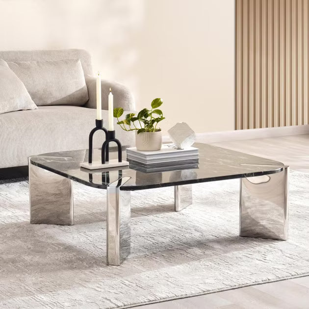 تُعيد طاولة قهوة أيسر تعريف تصميم القطعة المركزية بحضورها الآسر الذي يجمع بين الجرأة والتوازن. تصميمها المربع، المُغلف بالفولاذ المقاوم للصدأ بلمسة فضية، يُحيط بسطح رخامي أخضر خلاب - أنيق، ذو ملمس ناعم، ومُعروق بشكل طبيعي ليمنحك لمسة نهائية فريدة. كل خط مُصمم بعناية، وكل سطح مُصقول، مما يجعلها أكثر من مجرد طاولة - إنها تجربة نحتية. بأبعاد 100 × 100 سم، توفر مساحة سطح واسعة دون أن تُثقل كاهل الغرفة. ارتفاعها المنخفض يمنحها أناقةً ثابتة، بينما يُخاطب التباين بين الرخام الخام والمعدن الأنيق أولئك الذين يُقدرون الشكل والوظيفة. صُممت لحياة عصرية، فهي سهلة الصيانة ومتينة هيكليًا - جاهزة للحظات اليومية والضيافة الراقية على حد سواء. إنها ليست قطعة أثاث تتلاشى في الخلفية. تقف أيسر بثقة عند تقاطع التصميم والمتانة. سواء وُضعت في دور علوي حديث أو صالة بسيطة، فإنها تُضفي جوًا من الدراما الهادئة - رقيقة، لافتة للنظر، وخالدة.
