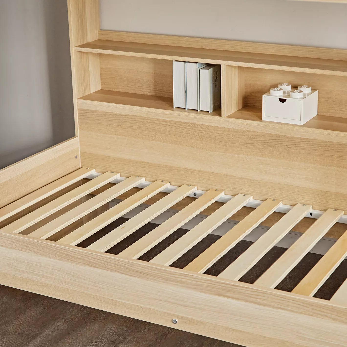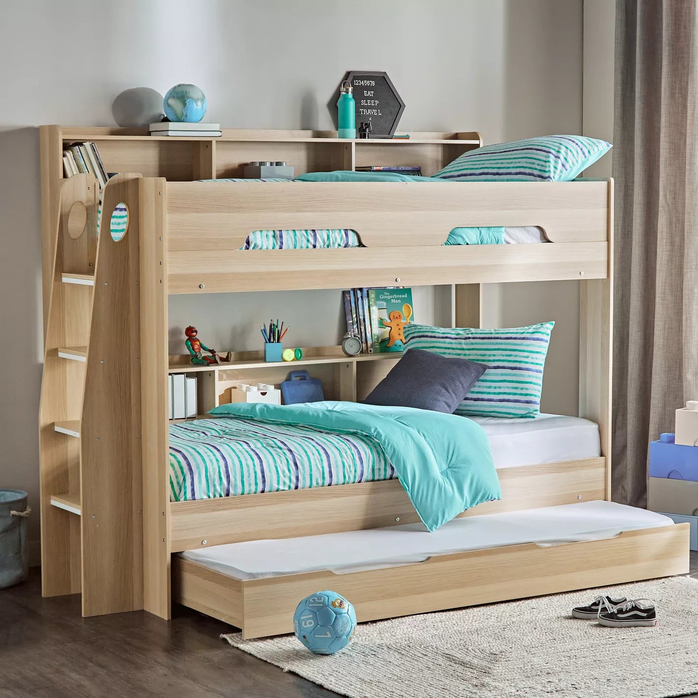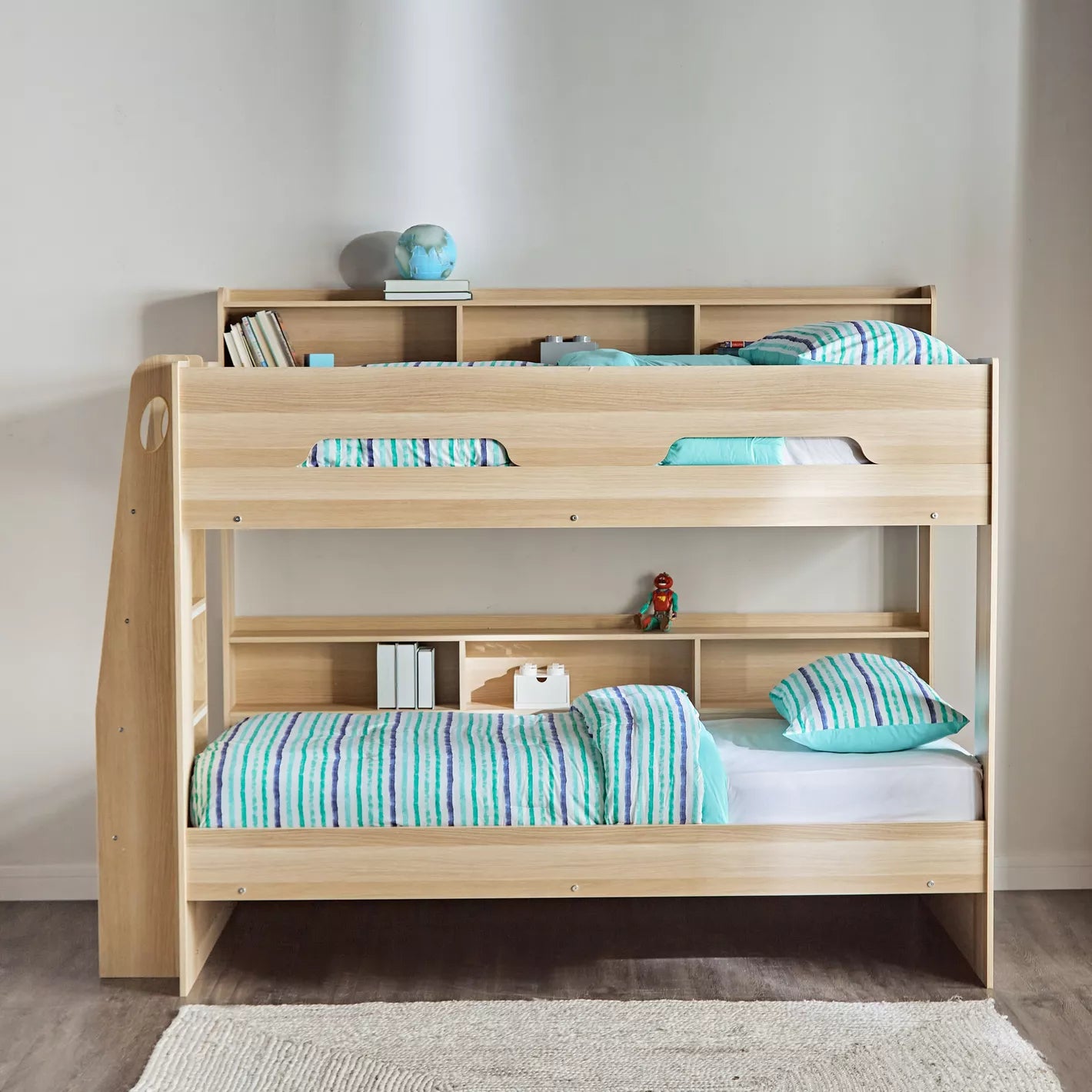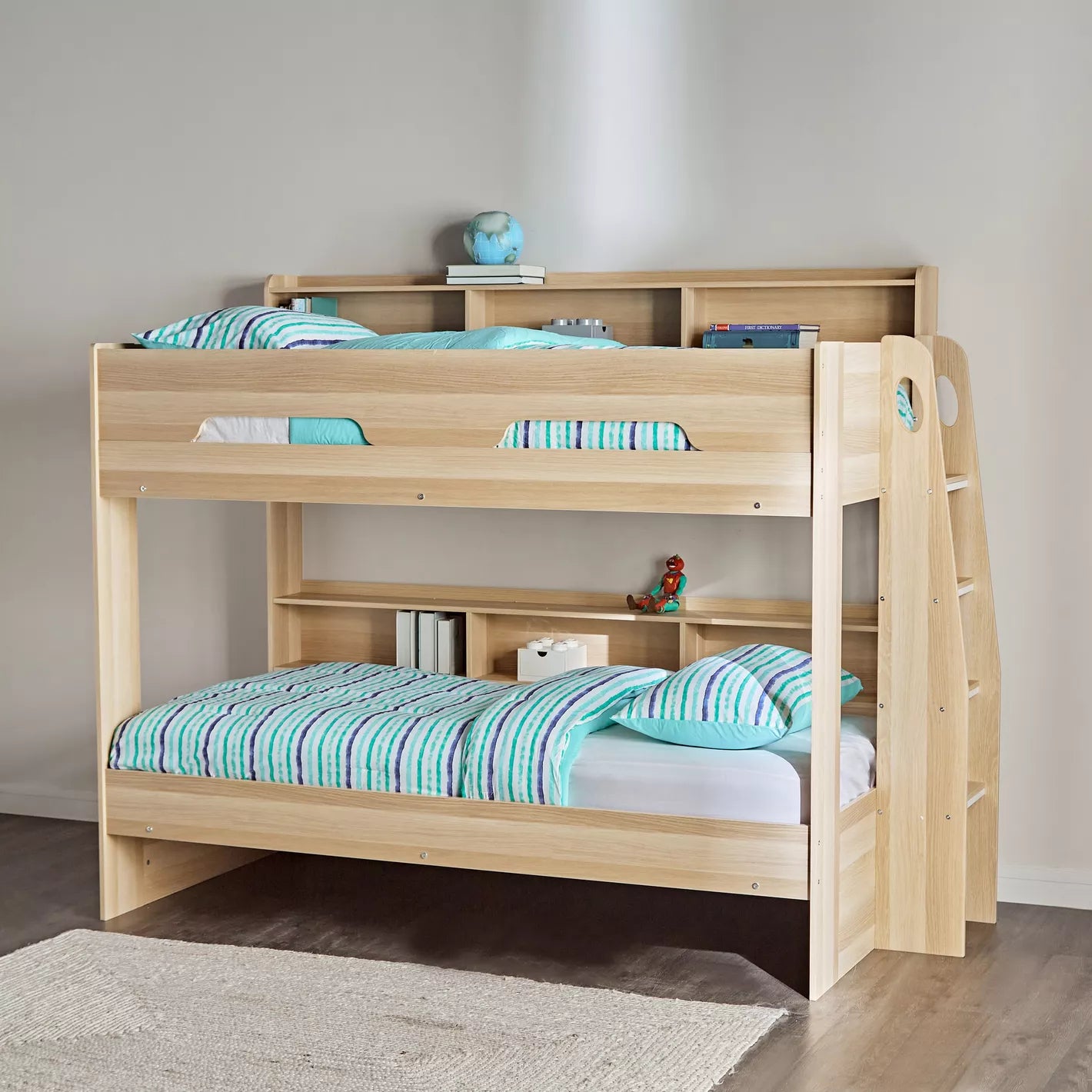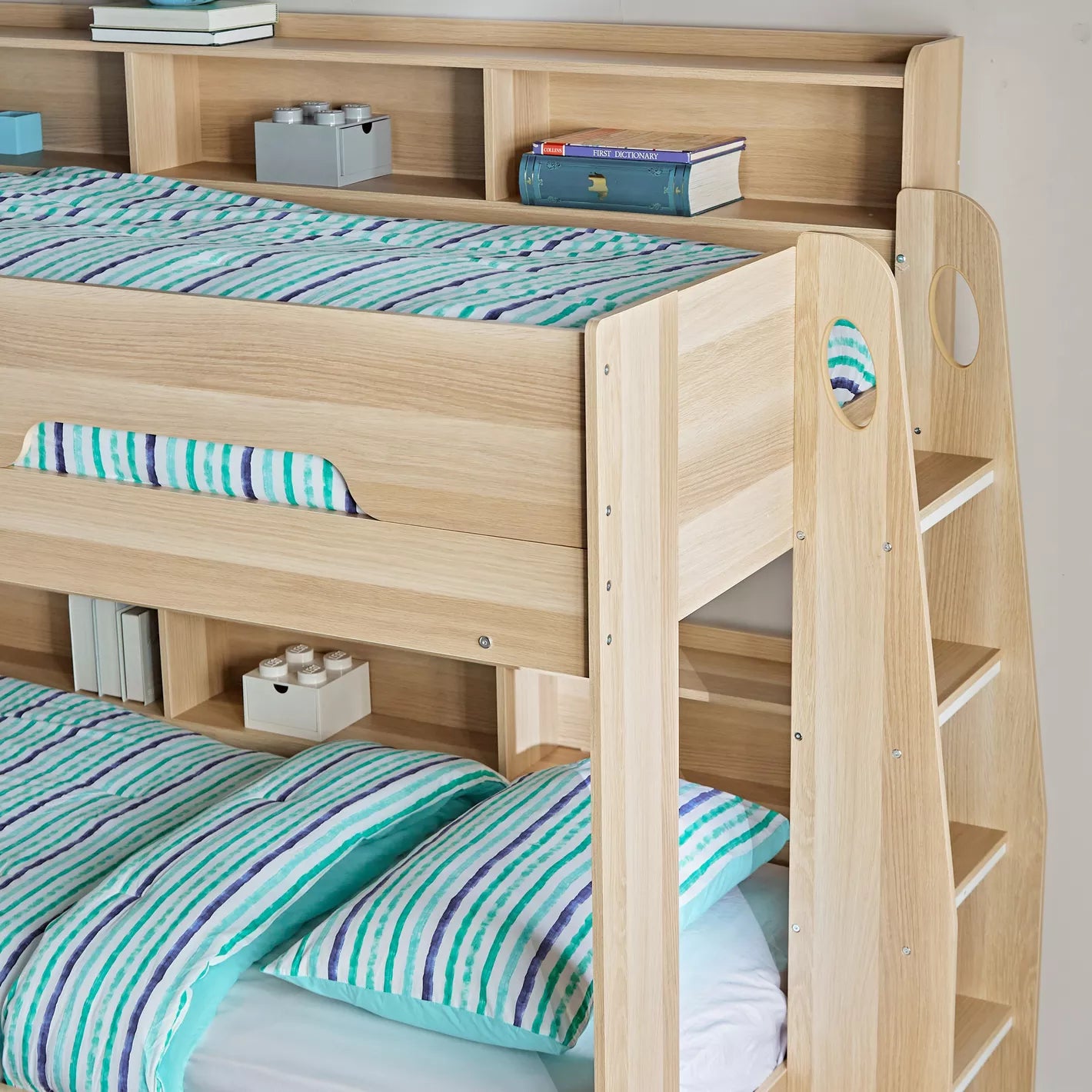 هذا السرير بطابقين مصنوع من الخشب المُصنّع بلمسة نهائية من الورق المصفح، وهو قطعة عصرية ومبتكرة يُمكن إضافتها إلى غرفة نوم طفلك. يحتوي على رفوف واسعة للكتب والألعاب في الخلف. صُمم السلم بمقابض مُقصوصة لسهولة التسلق، وشرائط "مُضيئة في الظلام" على الدرجات لإرشاد طفلك ليلاً أثناء النزول. يتسع السرير بطابقين لطفلين، لذا فهو يستحق الشراء.