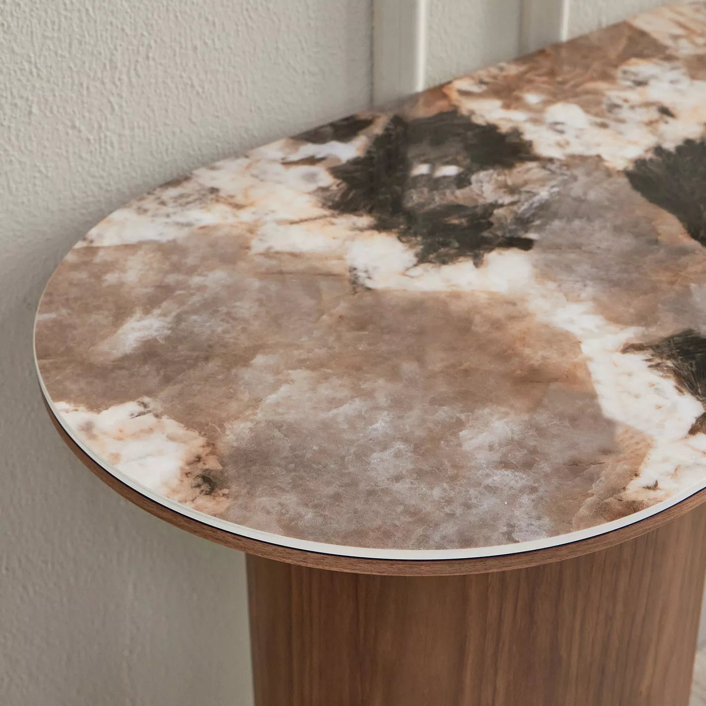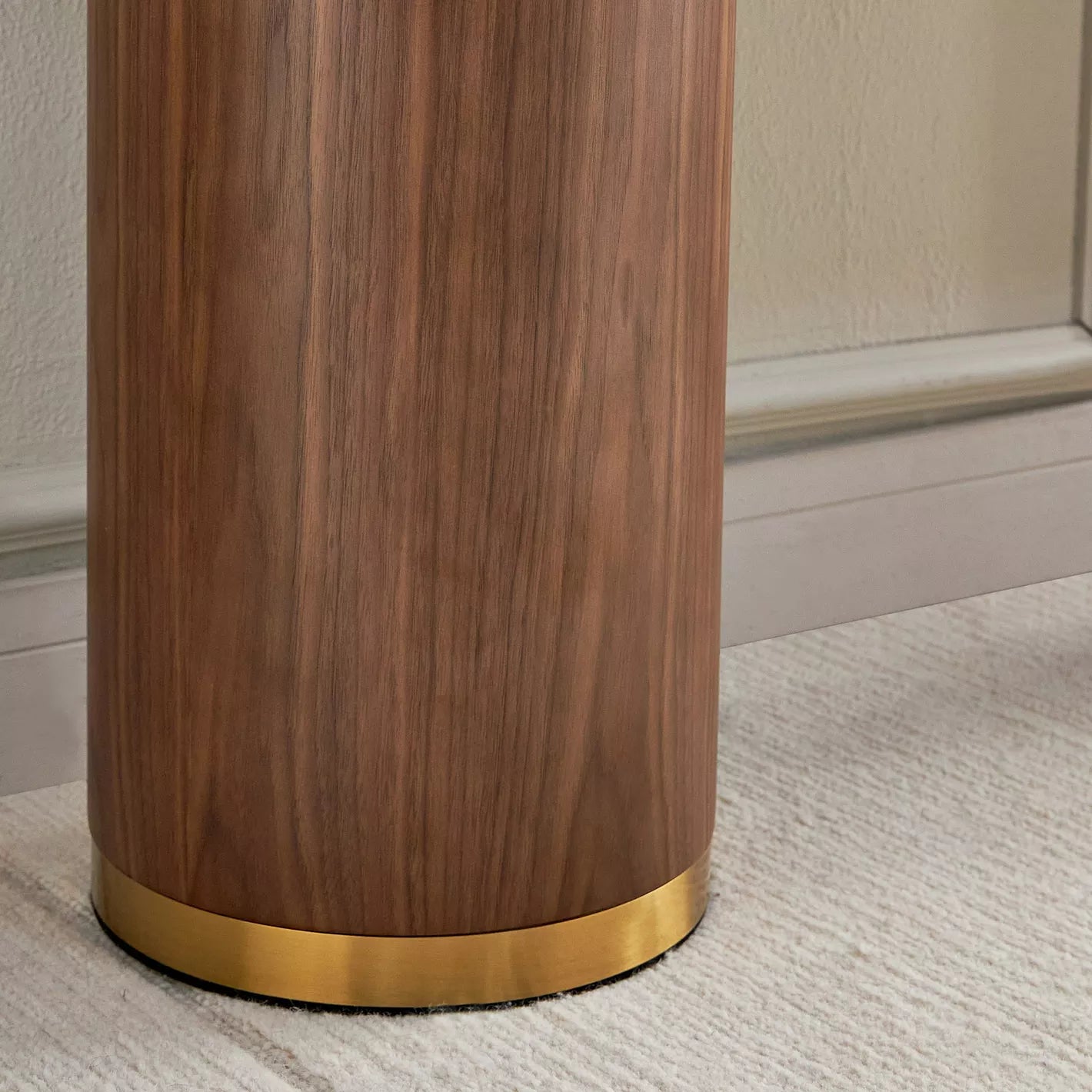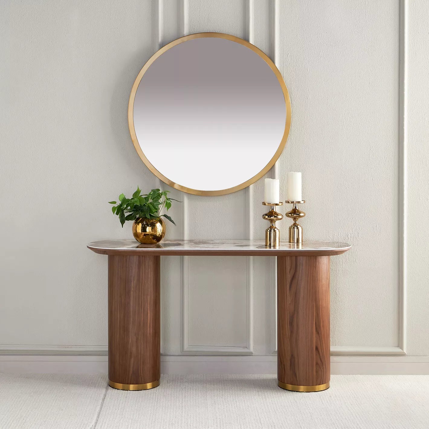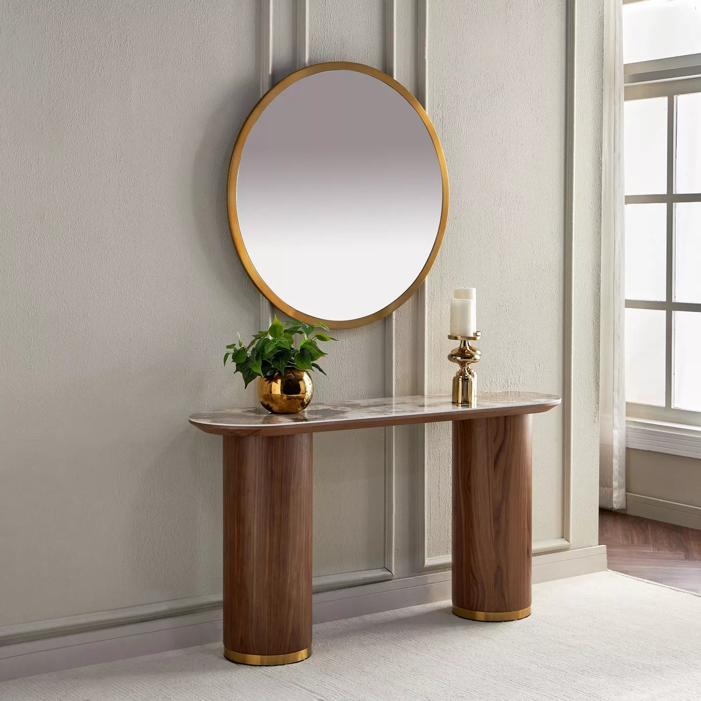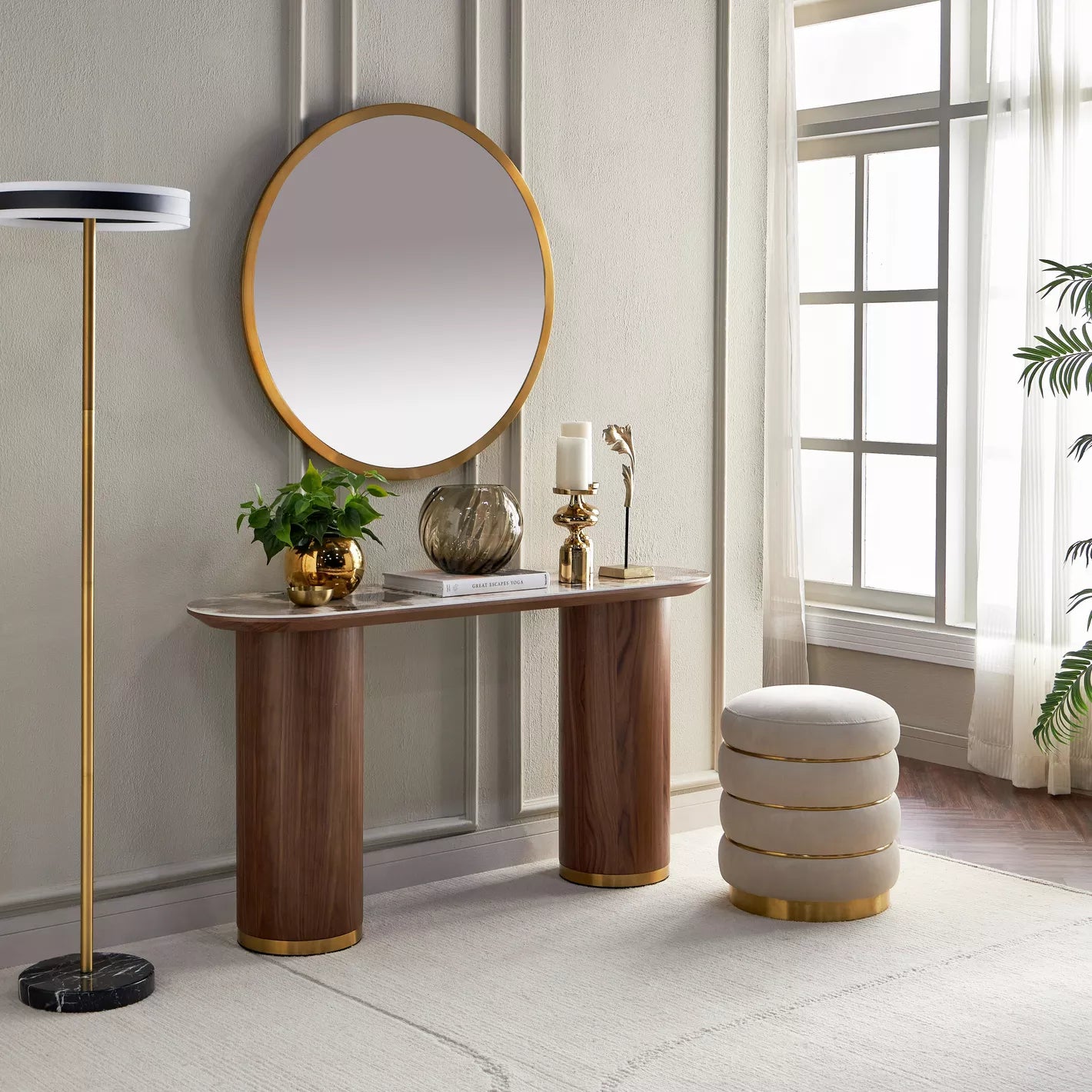 طاولة الكونسول هذه المزودة بمرآة تُضفي لمسةً أنيقةً وعمليةً على أي غرفة معيشة. لمستها الدافئة أنيقةٌ وعصرية، والمرآة تُضفي شعورًا بمساحةٍ أكبر. يوفر الرف مساحةً واسعةً لتخزين الكتب والقطع الزخرفية، أو حتى جهاز تلفزيون صغير.