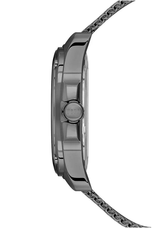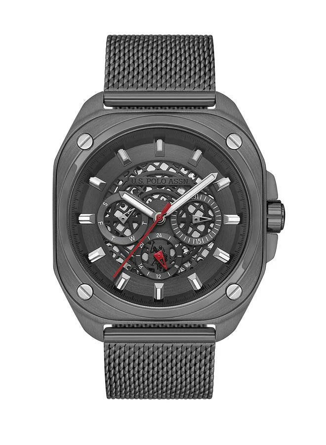 ساعة كروسينغ للرجال من يو إس بولو أسن، مقاس 43.50 مم، بميناء هيكلي بلون رمادي داكن وسوار شبكي ميلانو أنيق.