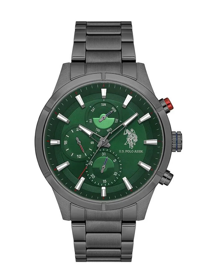 ساعة يو إس بولو أسن للرجال، 46 مم، مصنوعة من الفولاذ المقاوم للصدأ، بمينا أخضر مصقول وسوار جلدي بني.