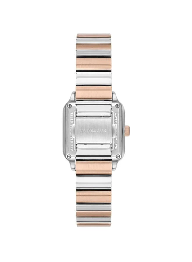 ساعة USPA2100-05، بعلبة مقاس 28×34 مم، مرصعة بعرق اللؤلؤ ومرصعة بالألماس المتلألئ، وسوار أنيق من الفولاذ المقاوم للصدأ باللونين الذهبي الوردي والفضي، وعلبة مربعة فريدة، تجمع هذه الساعة بين الرقي والأناقة. يضفي شعار جمعية بولو الأمريكية الشهير لمسة من الرقي، ليضمن لك التميز الدائم.
