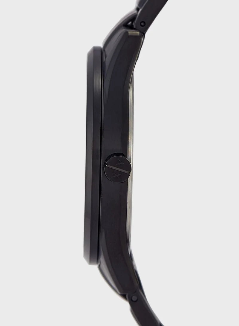 Shiny and polished stainless steel bracelet Round dial with marked hour and minute indices Chronograph function and triple arm analogue movement Secure fold over clasp and push lock closure Armani Exchange signature branding Comes packed in a branded box
