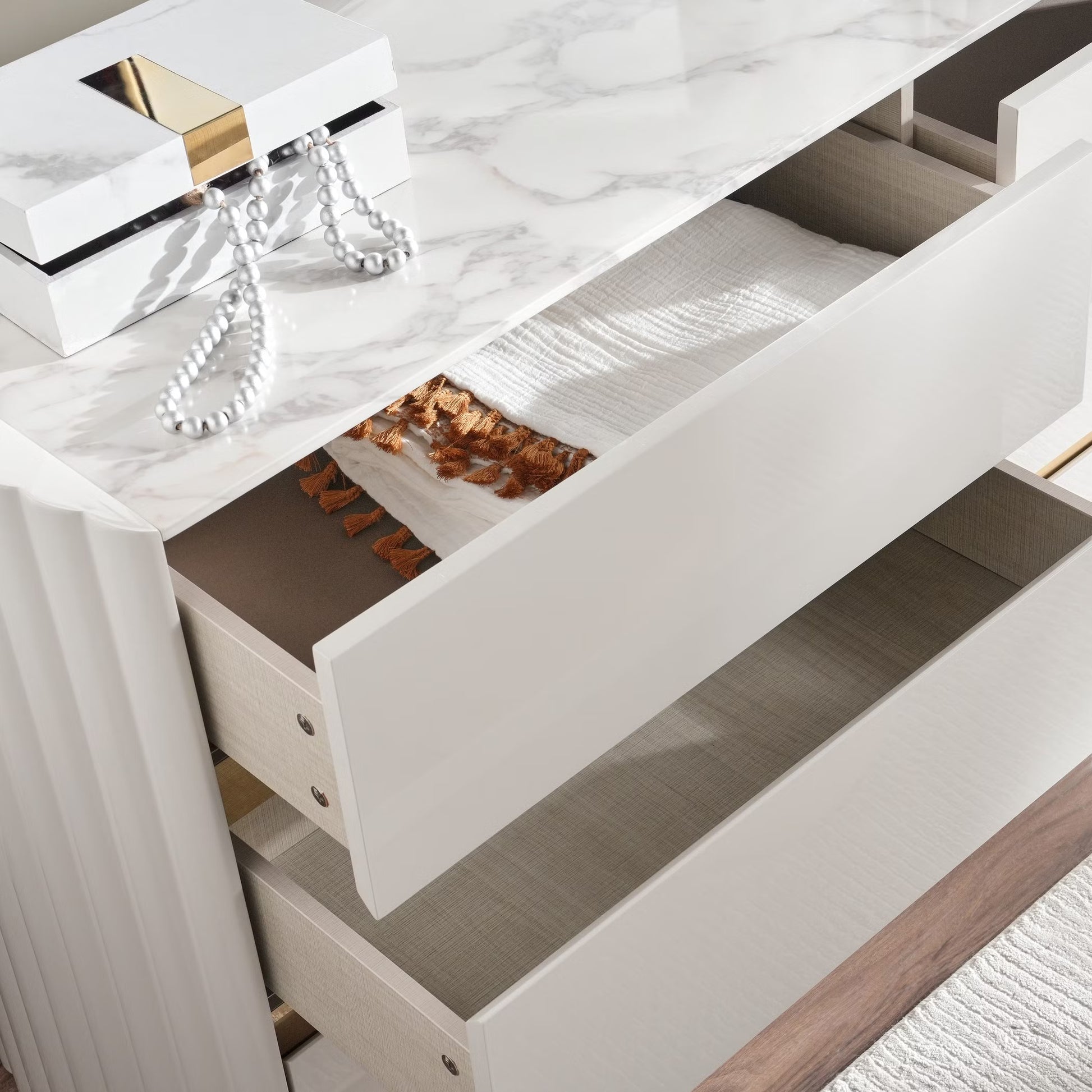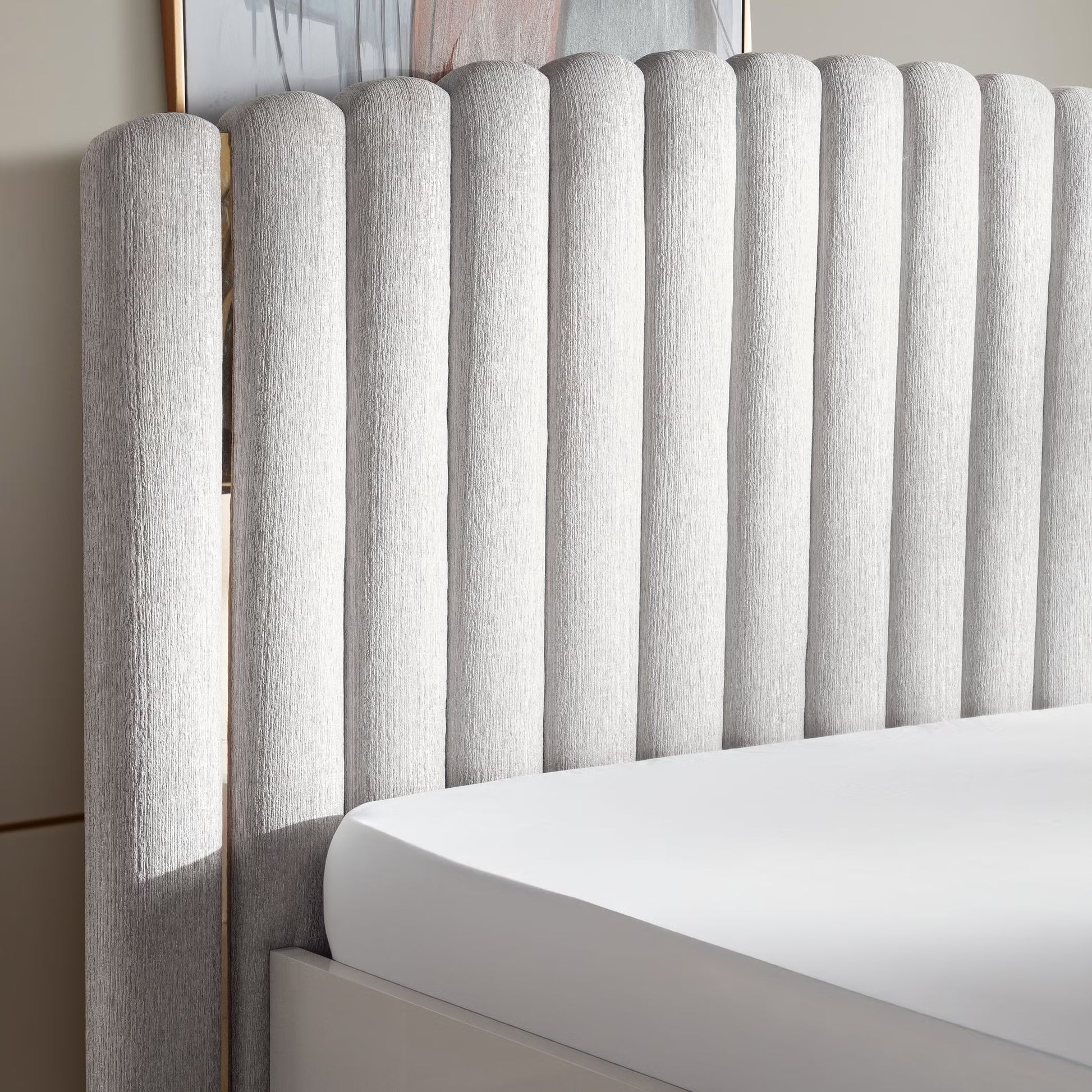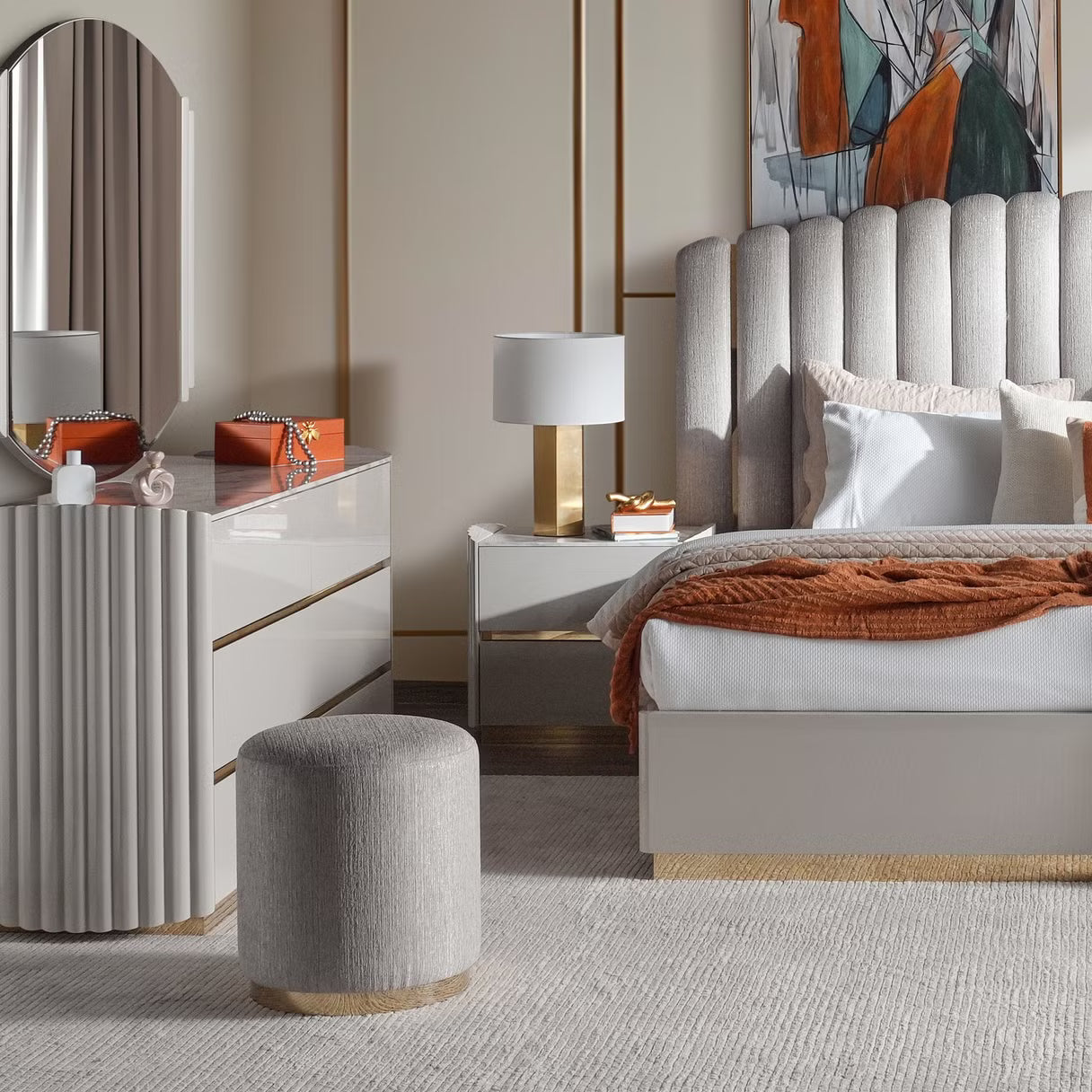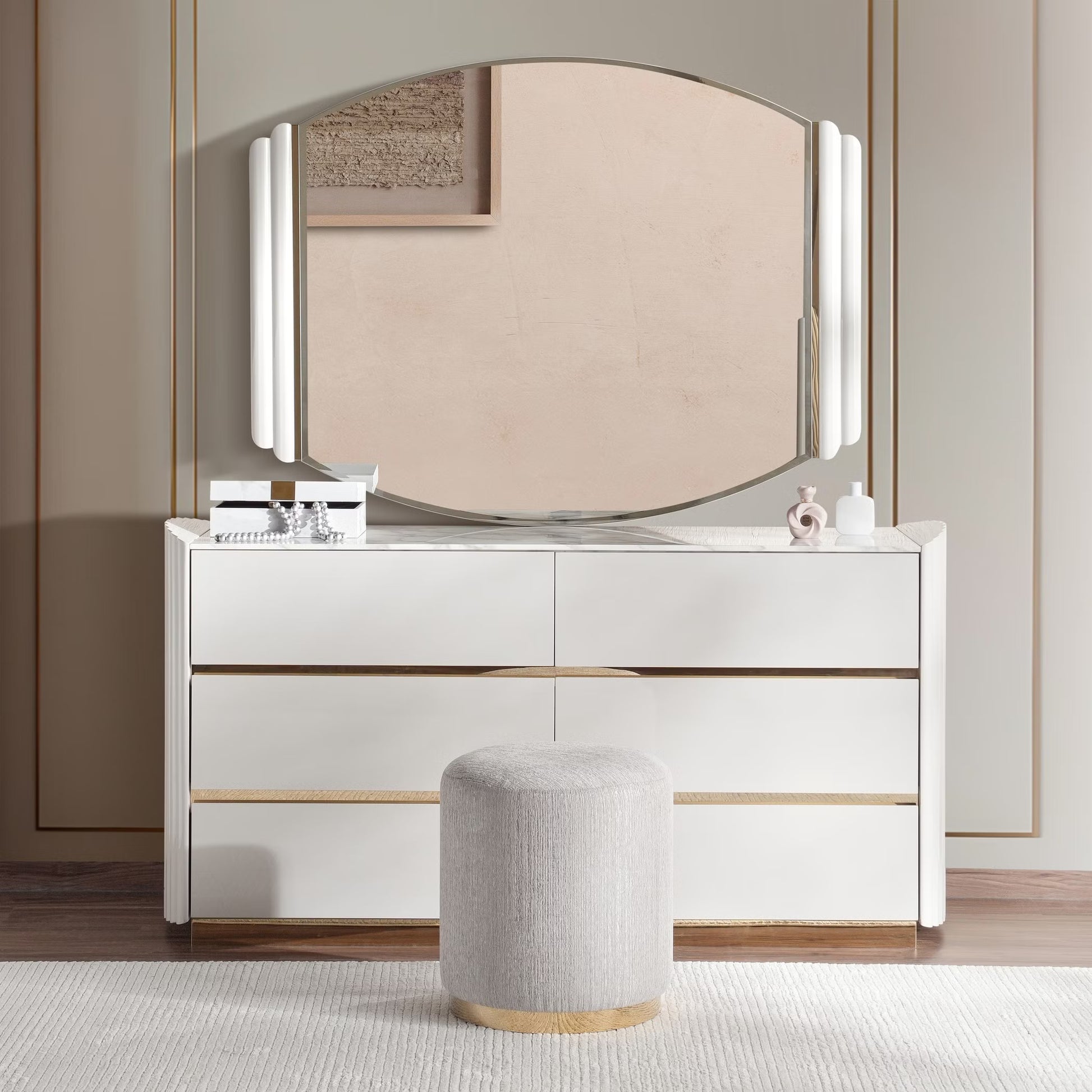 Composed with balance and quiet elegance, the loway 6 Pc Bedroom Set (180X200) in high gloss light grey introduces a sense of modern refinement to the bedroom. The king-size bed, measuring 222 cm in length, 230 cm in width, and 150 cm in height, becomes the focal point with its subtle fabric accents, sleek silhouette, and elevated frame that provides generous floor clearance. The soft sheen of the light grey finish lends a calming presence, creating an atmosphere both contemporary and enduring. The ensemble extends with a dresser at 160 cm by 49 cm by 81 cm, its drawers offering ample storage, paired with a mirror, 130 cm by 3 cm by 100 cm, that enhances light and proportion within the room. Two nightstands, each 66 cm long, 40 cm wide, and 56 cm high, provide symmetry and bedside functionality, while a stool, 45 cm by 45 cm by 47 cm, completes the composition with versatility and ease. Crafted from engineered wood in a lustrous high-gloss finish, refined with fabric details and subtle metallic essence, the Rowley suite embodies durability wrapped in sophistication. Together, these six pieces form a retreat defined by composure, utility, and modern grace.