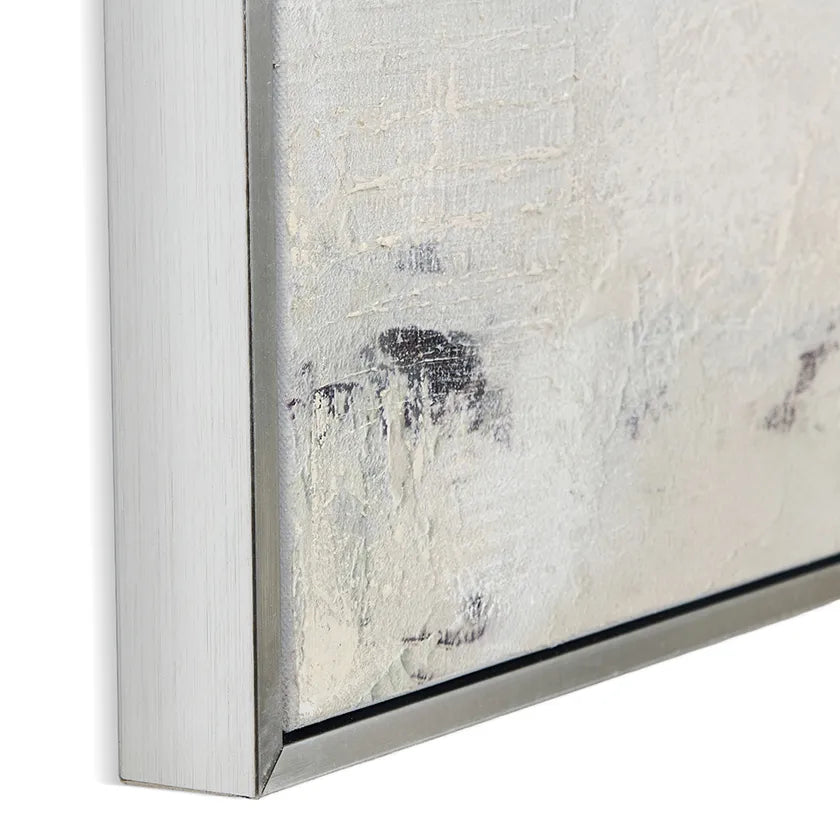 A serene square painting capturing the movement of gulls over a misty, abstract beach and ocean. Handpainted textures and soft white, gray, and blue tones make this piece a calming, coastal addition to any room, beautifully contained in a contemporary silver frame.